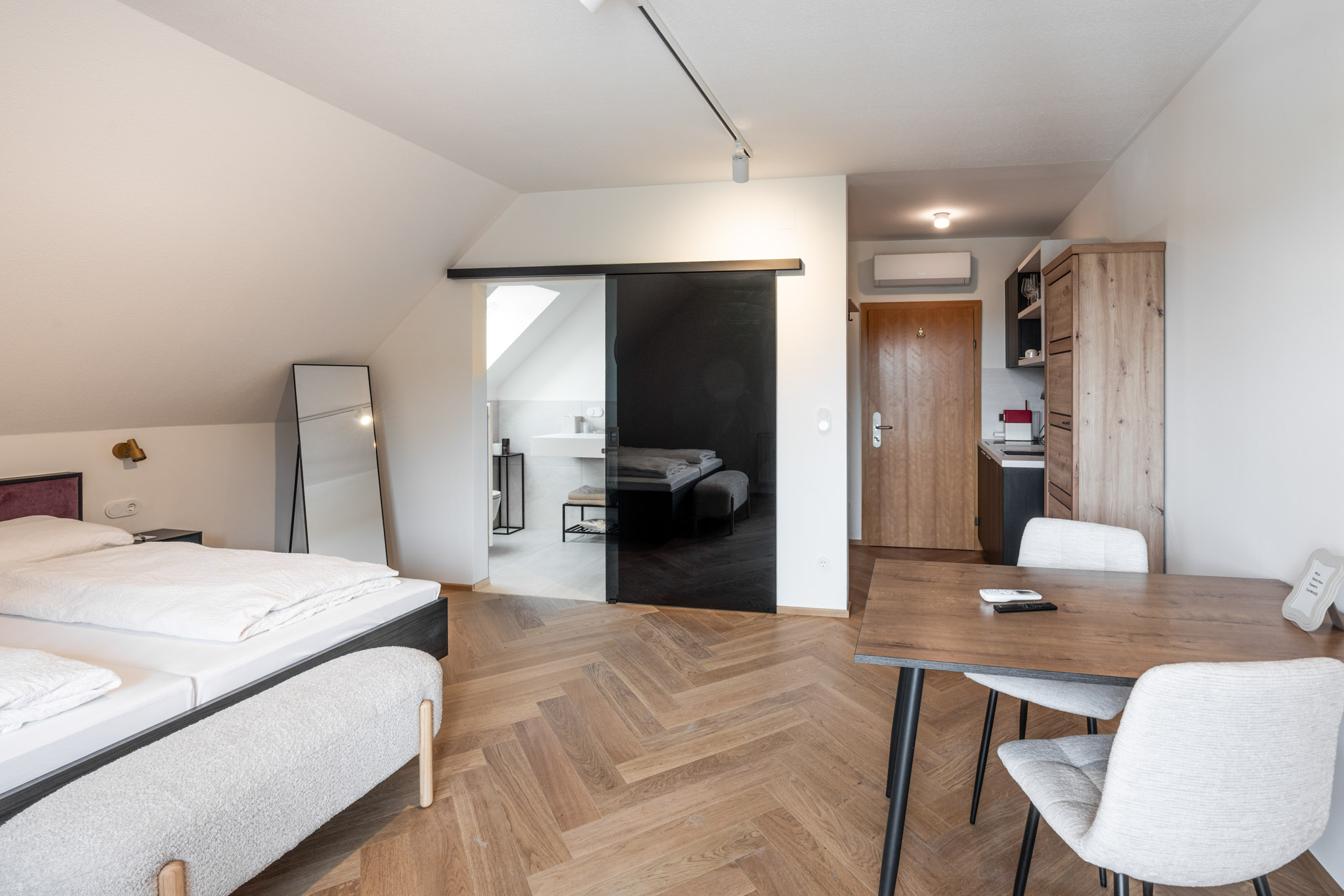 Großzügig, stilvoll, privat. Mit Wohn- & Schlafraum, besonderem Bad, Balkon und viel Platz zum Durchatmen. Ideal für Paare, Freund:innen oder Familien. Am Morgen wartet auf Wunsch ein liebevoll gefüllter Frühstückskorb – und im Wohlfühlraum findet ihr Raum für Gespräche, Genuss oder einfach Zeit für euch.